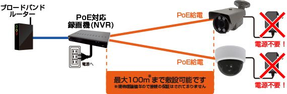 PoEとはイーサネット(LANケーブル)に映像などのやり取りを行うデータ通信以外に、給電可能な機器から電力を受電する仕組みです。 屋外設置などでカメラ用に電源を敷設することが困難な場合や、電源敷設工事が要らないので工事費が掛からず、ご家庭設置でも最適です。