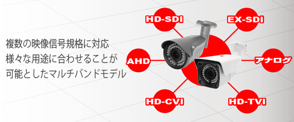 ■ フルハイビジョン撮影が可能なEX/HD-SDI規格に対応、従来のアナログシステムを利用したAHD規格、さらにはCVBS/HD-TVI/HD-CVIのアナログ規格としても切替えて使用できるマルチモデル