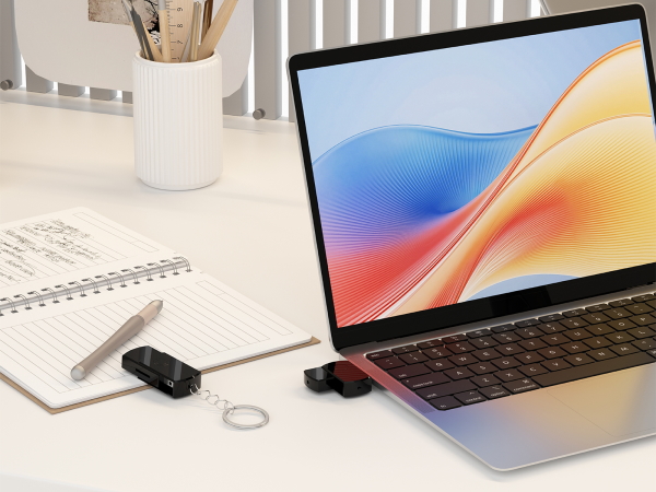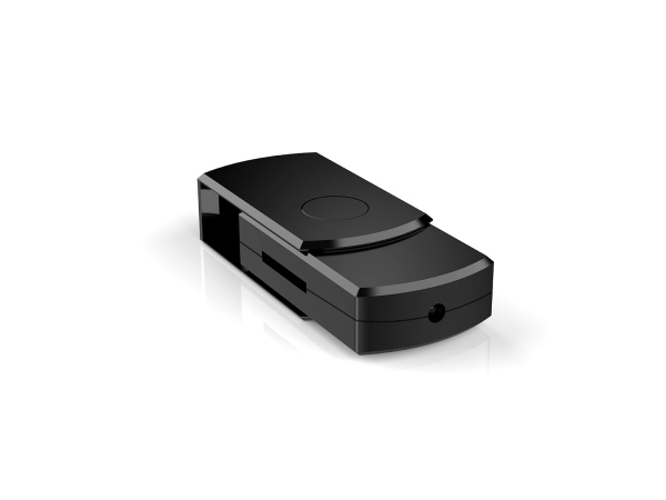 USBフラッシュメモリ型カメラ。カメラレンズが目立ちにくい。カメラと思えない外観。メモリカードを挿入し、USBメモリとしても利用可能